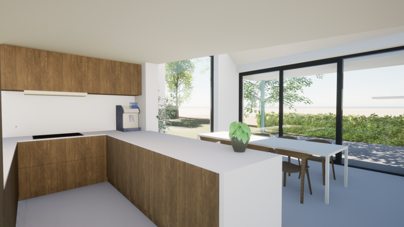 Vanop het tussenverdiep van de bestaande trap wordt toegang gecreëerd tot een nieuwe bureauruimte. Deze is open door middel van een vide met de eetruimte in de leefkeuken, wat een extra ruimtelijk gevoel creëert.